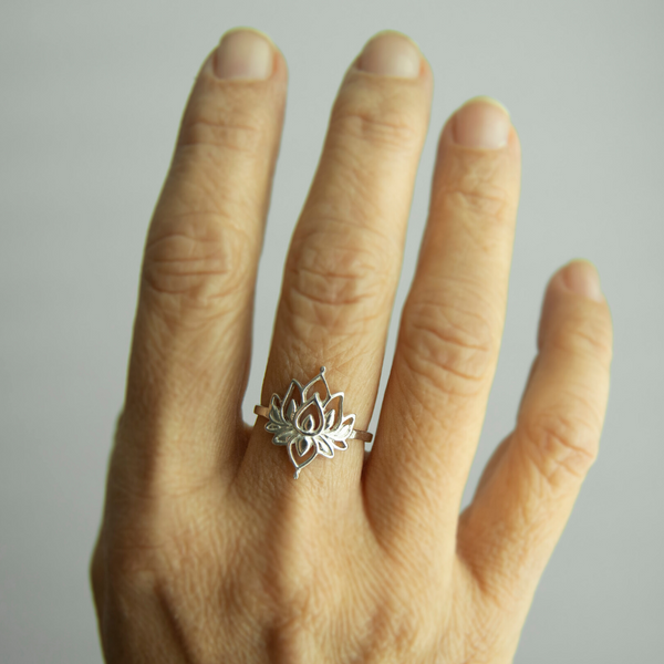 This sterling silver Lotus Ring is named for the Sanskrit word for lotus, "पद्मा" or "padma." The Lotus is the most sacred flower, symbolizing ultimate beauty and new beginnings. This most beautiful of flowers performs a little miracle every day as it grows out of the mud to bloom so beautifully. The mud represents the struggles of life, the blooming is your strength in overcoming the struggle and thriving.