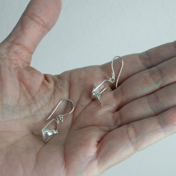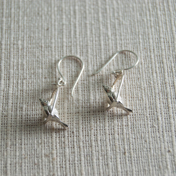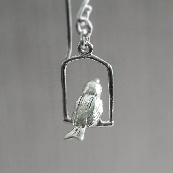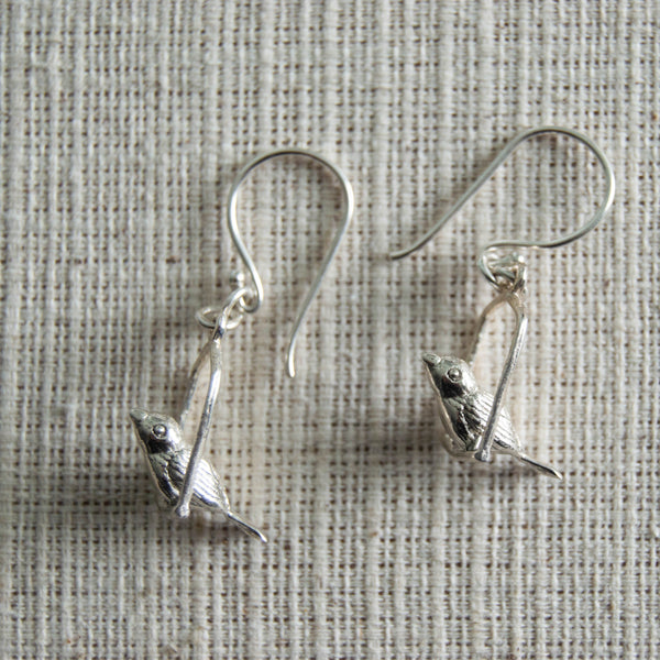 These earrings feature two precious little birds on a perch. They are lifelike, 3 dimensional birds carved with feather detailing and cast in .925 silver before being finished by hand.