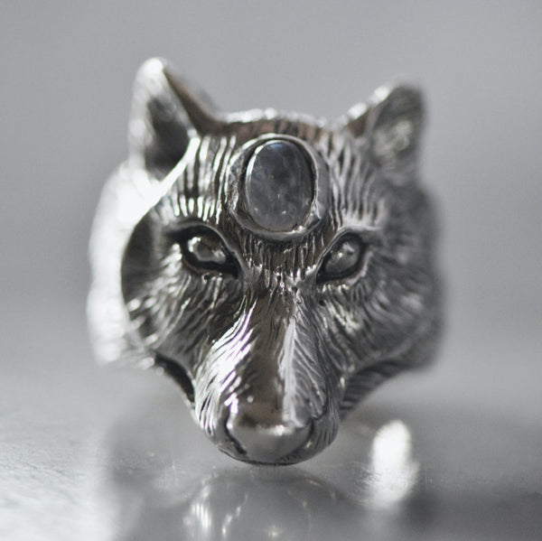 Our Sterling Silver Wolf Ring is adorned with a moonstone, the traveller's stone. It's the perfect totem for those who value the wolf's sharp intelligence, trust in instinct, independent spirit, and ability to form deep emotional connections.