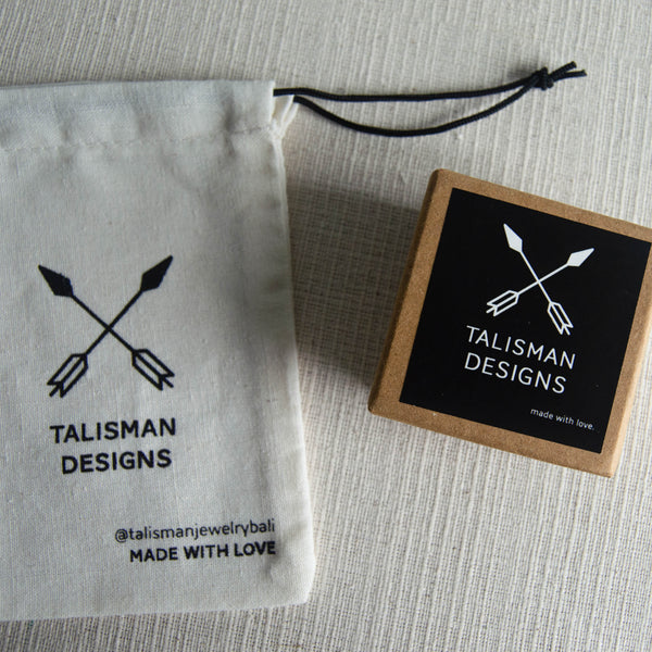 All of our pieces come ready to gift in a complimentary box and Talisman pouch. The boxes are made with eco-friendly recycled Kraft paper with black interior and the pouches are made of white linen. They're the perfect place to store not only your newest piece but also your all-time favorites.