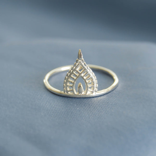This ornate ring is named for the Sanskrit Eta, meaning "luminous". Every aspect of this piece is thoughtfully designed and crafted - from the band, delicate and rounded for comfort, to the central symbol, a design inspired by the Antaralas (vestibules) of the ancient Khajuraho temples in Madhya Pradesh, India.